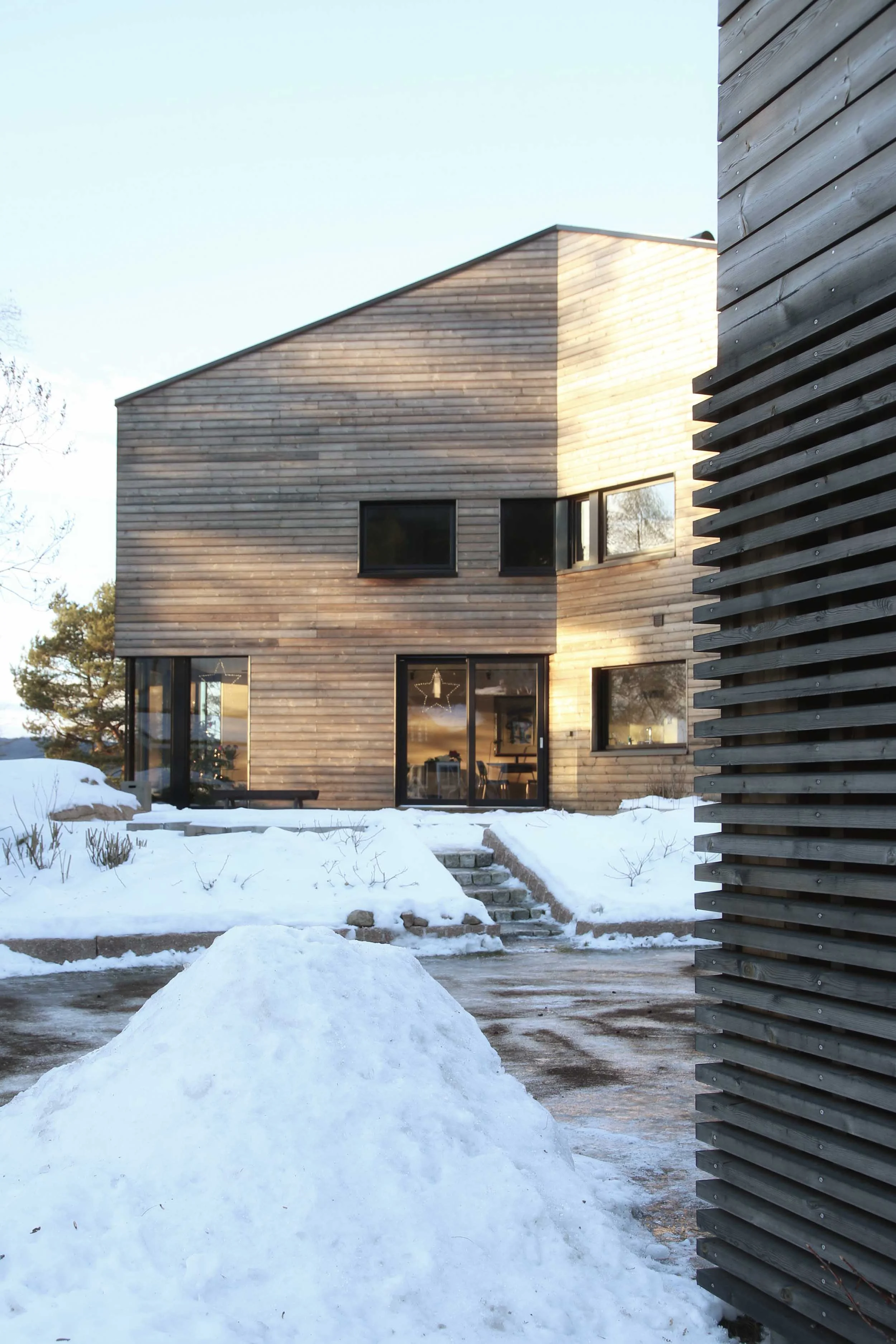 All facades are clad with ore-pine (heartwood of prepared old-growth mountain pines), that will turn silver gray as it ages. The panel is treated only with iron vitriol to even out the grey, as the wood is sufficiently resistant in itself to withstand the strain of time and weather.